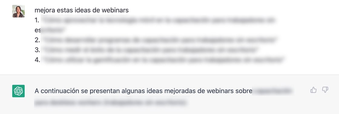 Estoy explorando terreno desconocido en la temática de webinars que estaremos desarrollando en Nivelat (y si quieres saber más, vas a tener que inscribirte a ellos). Le pregunté a Chatbot si me podía dar ideas para webinars asociadas a X concepto.